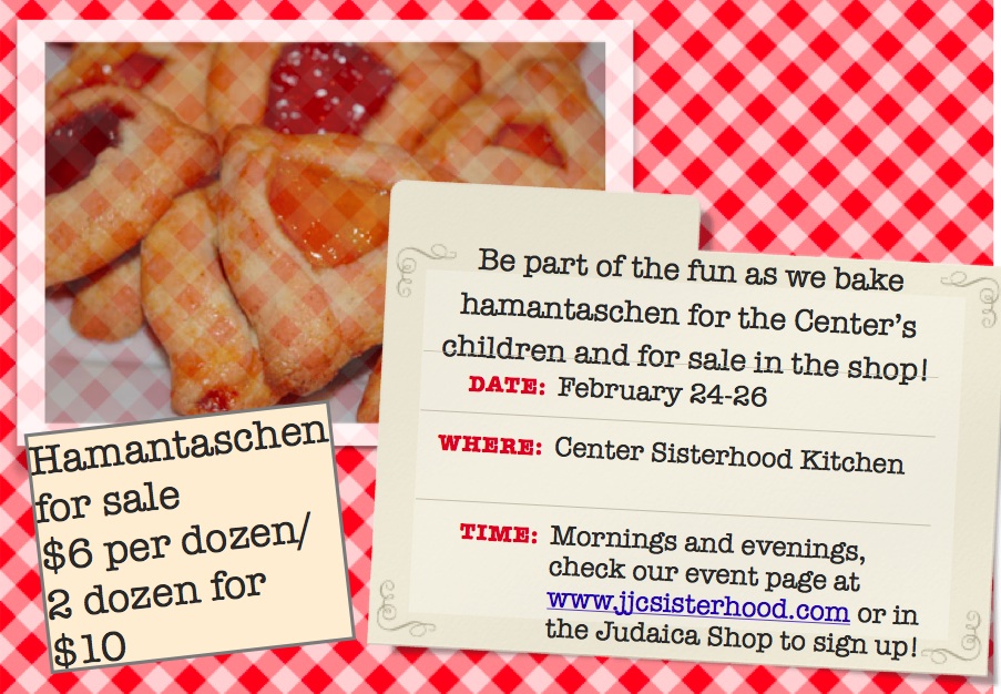Join us next week to bake Hamantaschen! Posted on February 21, 2014 by jjcsisterhood Monday Feb 24 9am-12, 1-4pm, 7-9pm Tuesday Feb 25 9am-12, 1-4pmWed Feb 26 9am-12, 1-4pm Related