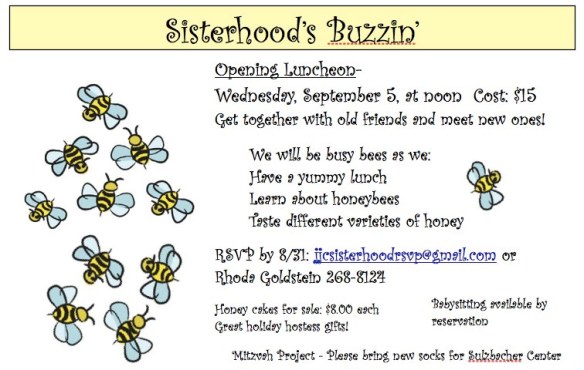 In case you missed it, here is a recap of JJC Sisterhood’s opening meeting on September 5, titled ‘Sisterhood’s Buzzin’’. Kim Glasgal, President, opened the meeting by thanking the chair of the event, VP of Programming, Rhoda Goldstein, who orchestrated a complex program. After a few brief announcements and singing of anthems, Sylvia Lubliner gave a wonderful Dvar Torah. We are fortunate to have her as the VP of Education! She then spoke about the Women’s League position on Amendment 6 and encouraged members to find out more about this important woman’s issue. Susan Lubliner led the Hamotzi beautifully after which we enjoyed lunch with old and new friends. Rhoda Goldstein introduced the program which included a presentation by the president of the local beekeepers society about how bees make honey – a staple of our New Year festivities. Rabbi Olitzky spoke about the paradox of honey. It is the only kosher food that is produced by a non-kosher animal. He talked about why that was and about early mentions of honey in the Torah. We will certainly remember his analysis: “Where there is a Halachic will, there is a Halachic way”.