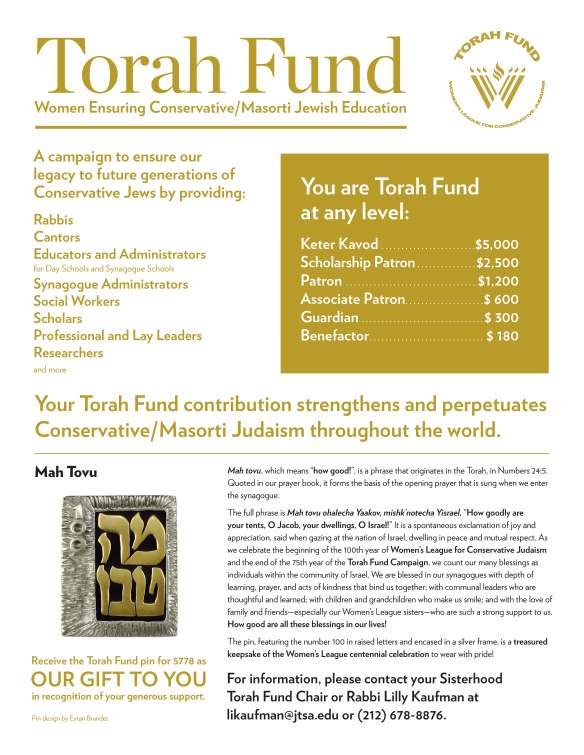 The Torah Fund Campaign of Women’s League for Conservative Judaism is the dedicated philanthropy of Women’s League, its members, and its affiliated sisterhoods in Conservative congregations across North America. Torah Fund strengthens Jewish education by supporting scholarships and programming at these Conservative/Masorti institutes of higher Jewish learning: